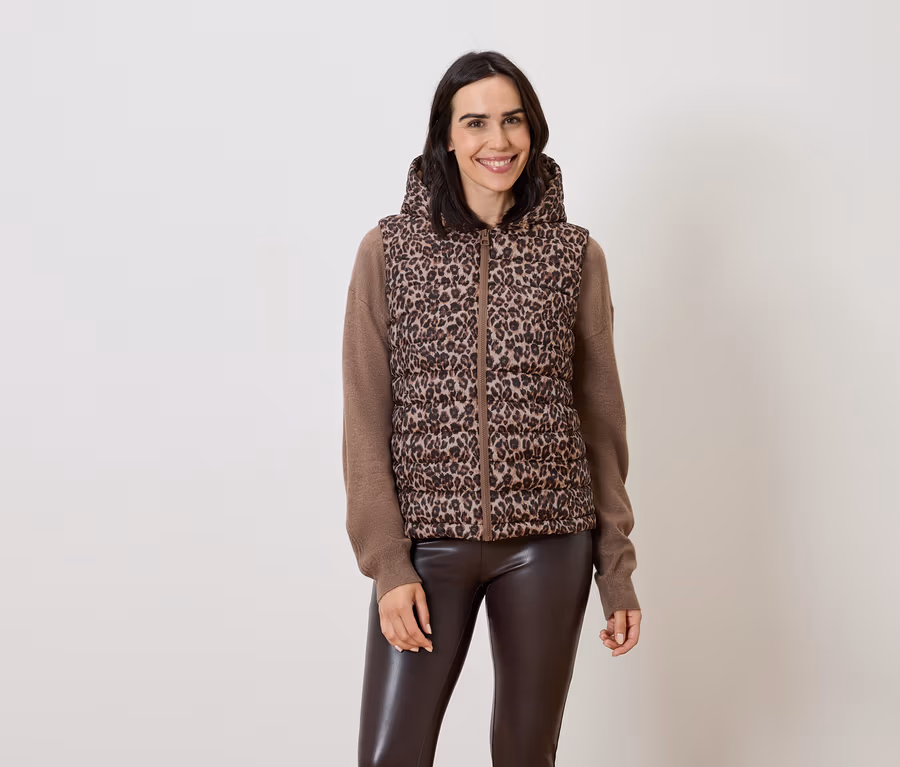 Pikowana kamizelka z kapturem, beżowa w czarno-brązową panterkę na całej powierzchni