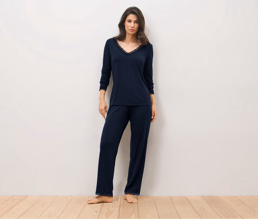 - Dekolt w serek oraz zakończenia rękawów i nogawek obszyte delikatną koronką