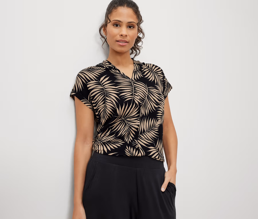 - Czarna z beżowym nadrukiem liści palmowych
