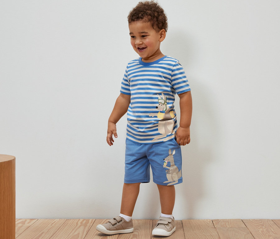 1x pastelowożółta z aplikacją z żółwiem i niebiesko-różowymi odwracanymi cekinami, 1x w niebiesko-kremowe paski z aplikacją z kangurem