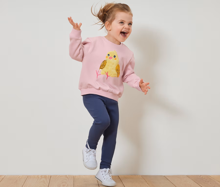 - Rozmiar 86/92 z nadrukiem kurczaczka, od rozmiaru 98/104 z aplikacją z kurczaczkiem