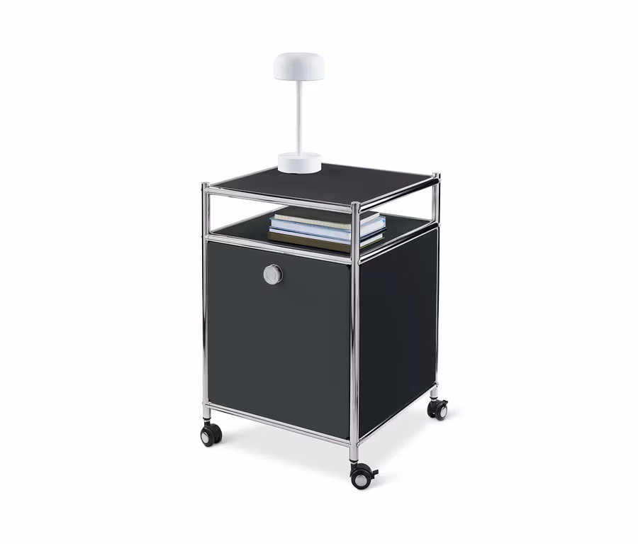 - Kontener na kółkach z chromowaną, metalową konstrukcją i gałką