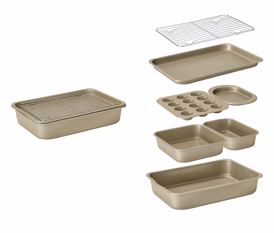 Marzenia o złocistych wypiekach staną się rzeczywistością dzięki temu kompaktowemu zestawowi do pieczenia. Składający się z formy do pieczenia i zapiekanek z dzióbkiem do wylewania sosu, formy kwadratowej, formy do ciast, małej owalnej blachy do pieczenia, formy do muffinów na dwanaście małych muffinów, dużej blachy do pieczenia i kratki do studzenia, zestaw do pieczenia w kolorze złotym spełni wszystkie życzenia pani lub pana domu.