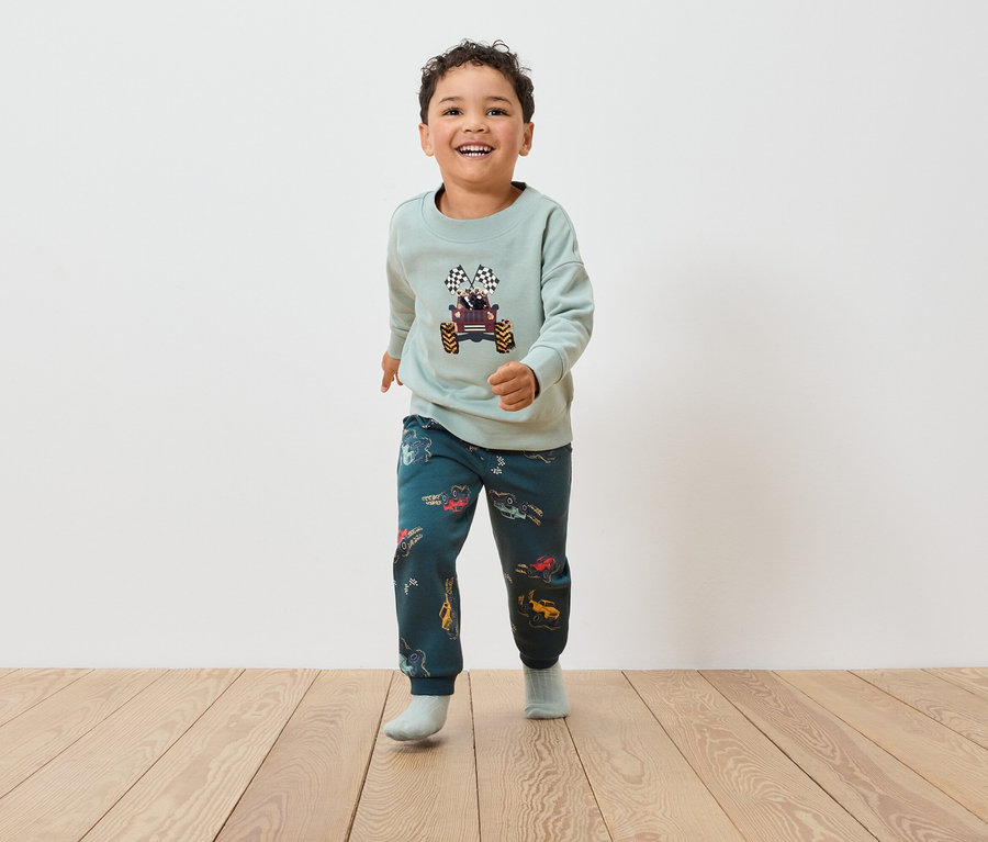 - Ciemnozielone z wielobarwnym nadrukiem monster trucków na całej powierzchni