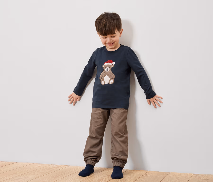 - 1x niebieska z wielokolorowym nadrukiem ciężaróki i białymi płatkami śniegu, 1x granatowa z aplikacją w biało-beżowe niedźwiedzie
