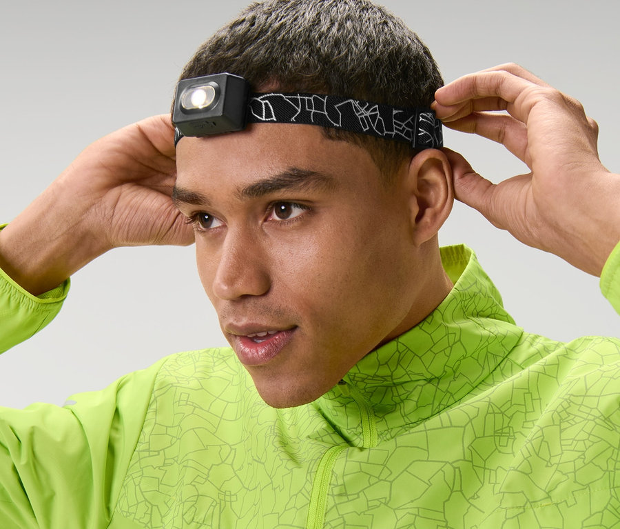 - Miękka, elastyczna opaska na głowę – z możliwością regulacji obwodu i elementami odblaskowymi