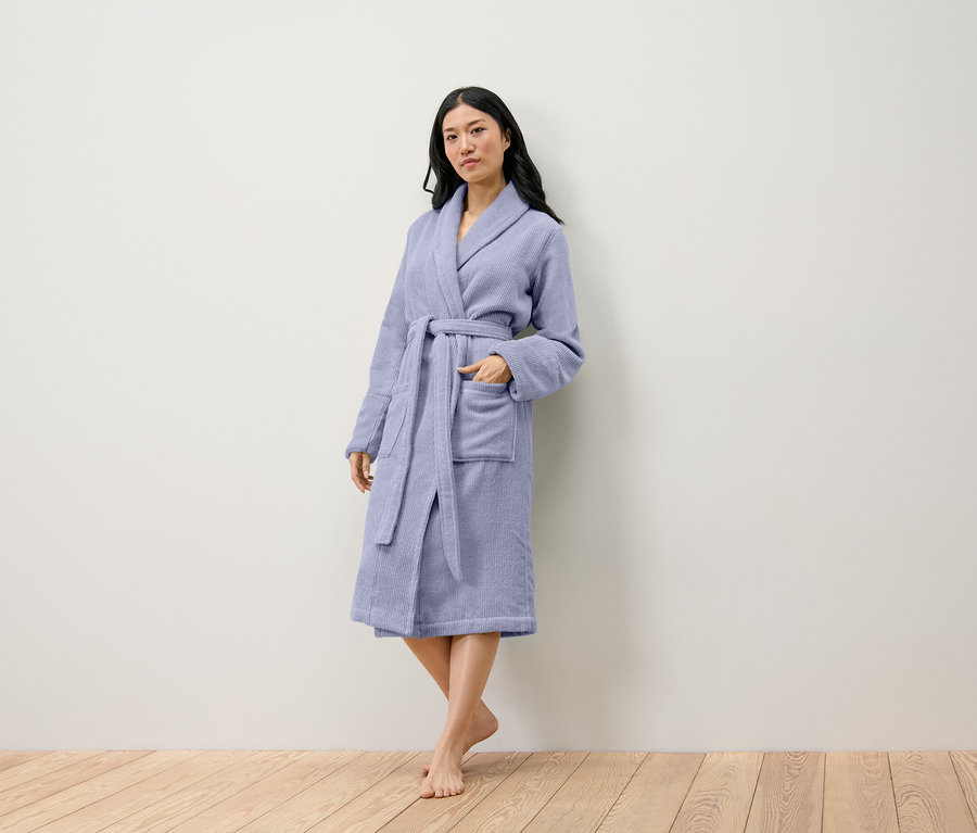 • Z kołnierzem szalowym, dwiema naszytymi kieszeniami i wiązanym paskiem