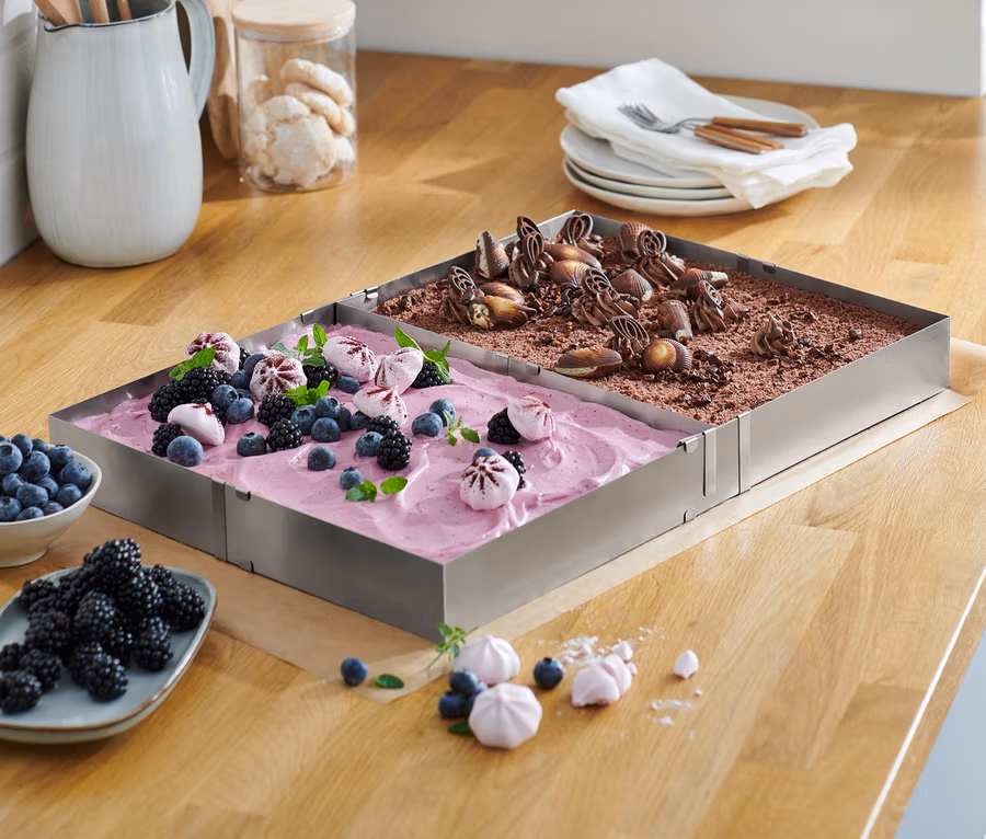 - Z praktyczną wewnętrzną przegródką – do pieczenia lub dekorowania 2 różnych ciast jednocześnie