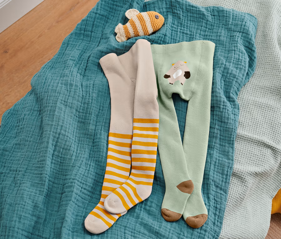Ciepłe rajstopy, z motywem potwora i biało-żółte w paski, 2 pary