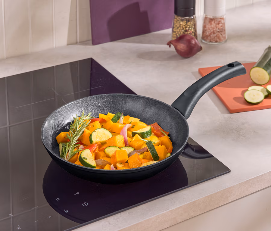 - Z powłoką nieprzywierającą niezawierającą PFAS – idealna do smażenia z niewielką ilością tłuszczu, zmniejsza przywieranie i przypalanie, chroni przed zarysowaniami, łatwa w czyszczeniu