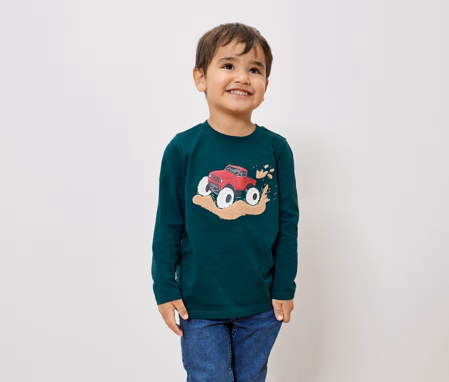 - 1x ciemnozielona z aplikacją w monster trucki, 1x w wielokolorowe paski