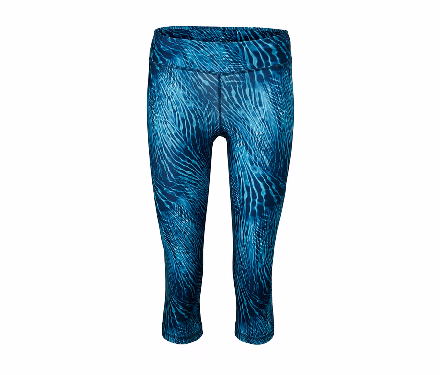 Spodnie sportowe dla pełnej swobody ruchów: w tych legginsach sportowych o długości 3/4, dokładnie przylegających do ciała, żadna pozycja jogi nie jest niemożliwa, podobnie jak żaden trening biegowy nie będzie w nich zbyt męczący. Dla uzyskania szczególnie modnego wyglądu, spodnie ozdobione są nadrukiem przypominającym obraz wody oraz detalami w kontrastowym kolorze.