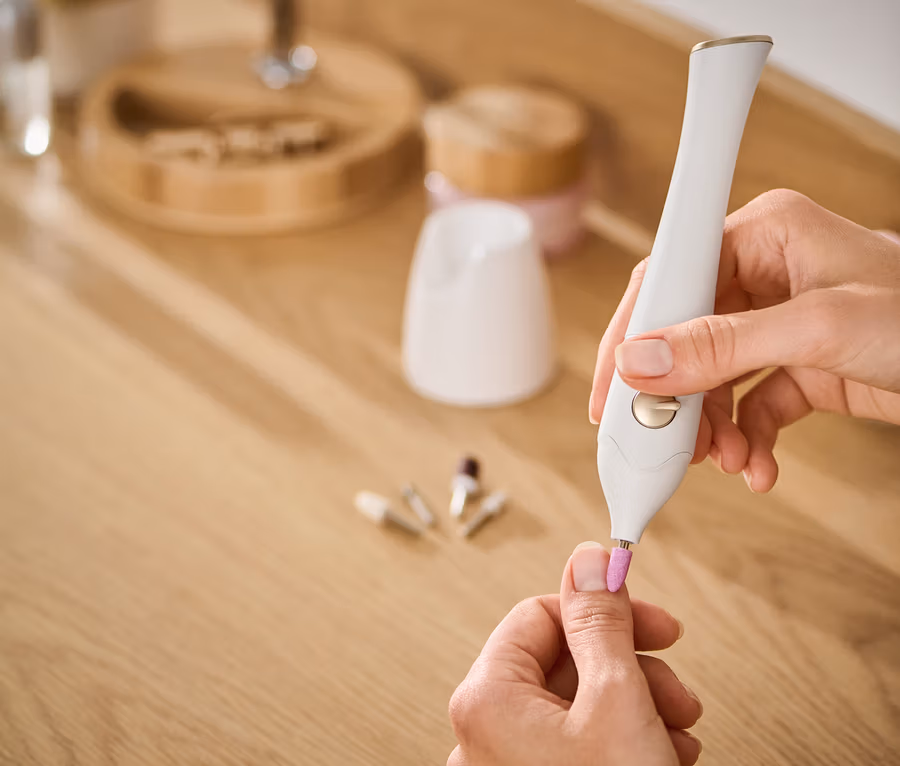 - Z pięcioma wymiennymi końcówkami: do skracania, modelowania i polerowania paznokci, a także do usuwania skórek i zrogowaceń