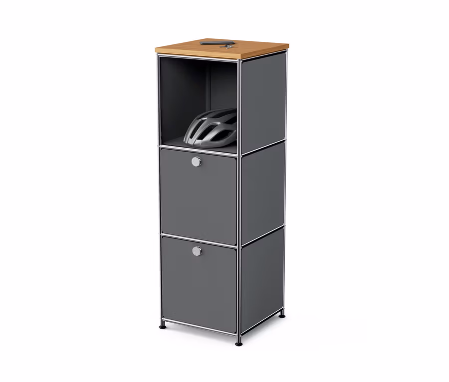 Wąska komoda metalowa „CN3” z drewnianym blatem i 2 klapami, szara