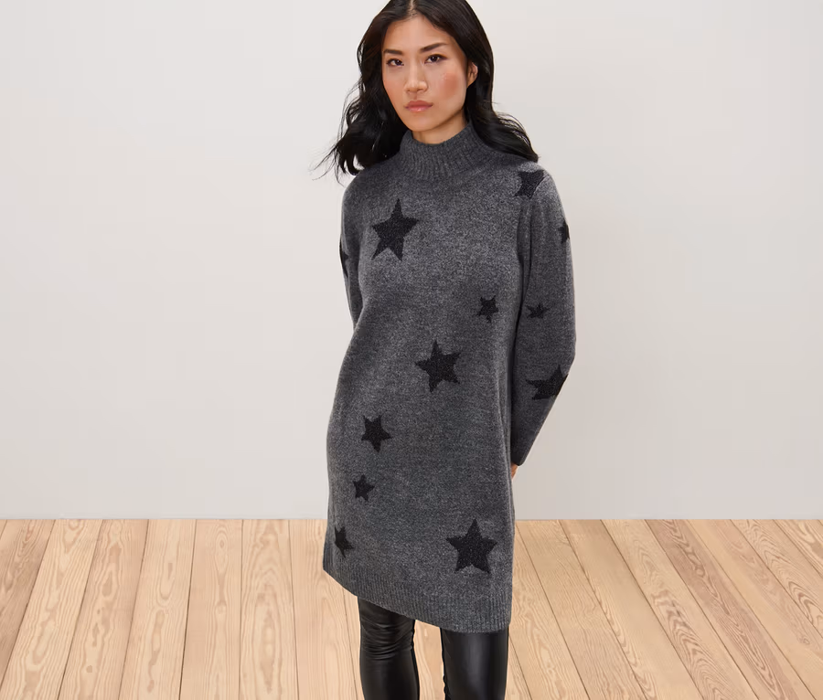 - Błyszczący, żakardowy wzór w gwiazdy z przodu i na rękawach