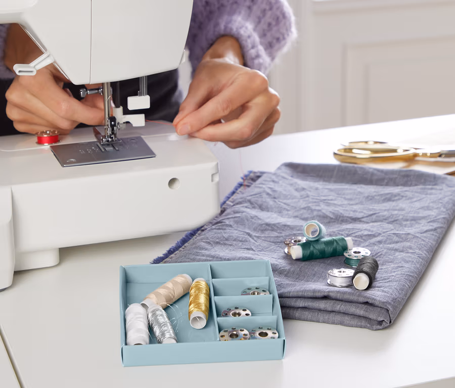 • 8 szpulek nici z dopasowanymi kolorystycznie cewkami do szycia w domu
