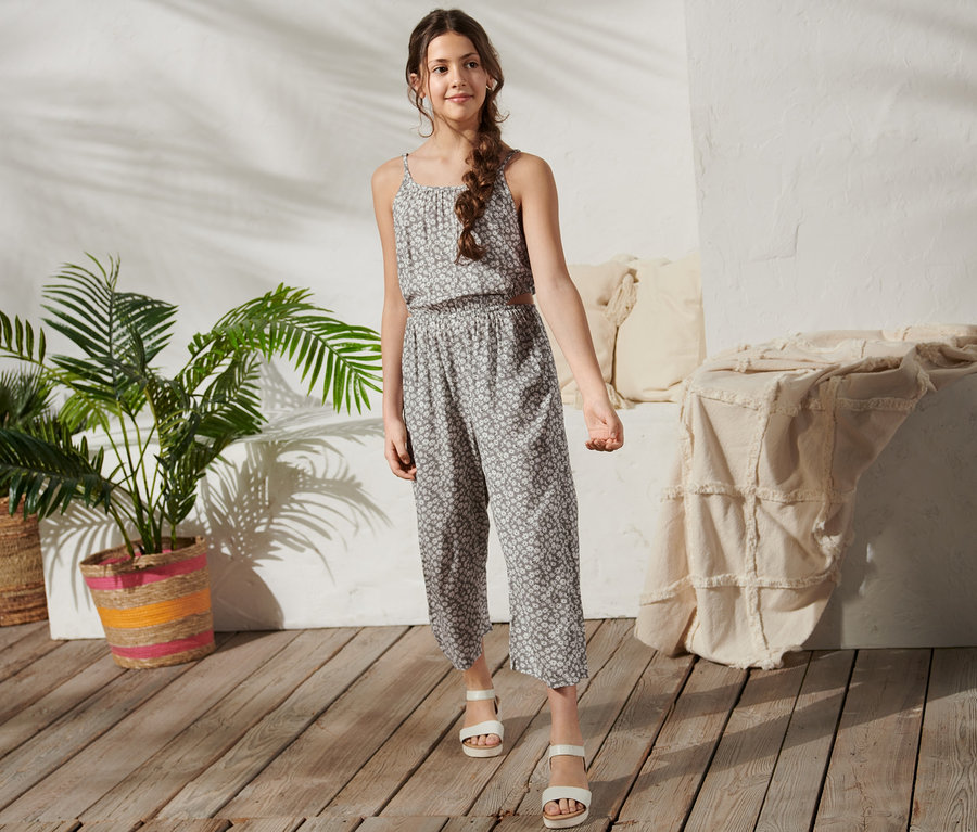 - Kombinezon z tkaniny z nadrukiem w kwiaty na całej powierzchni